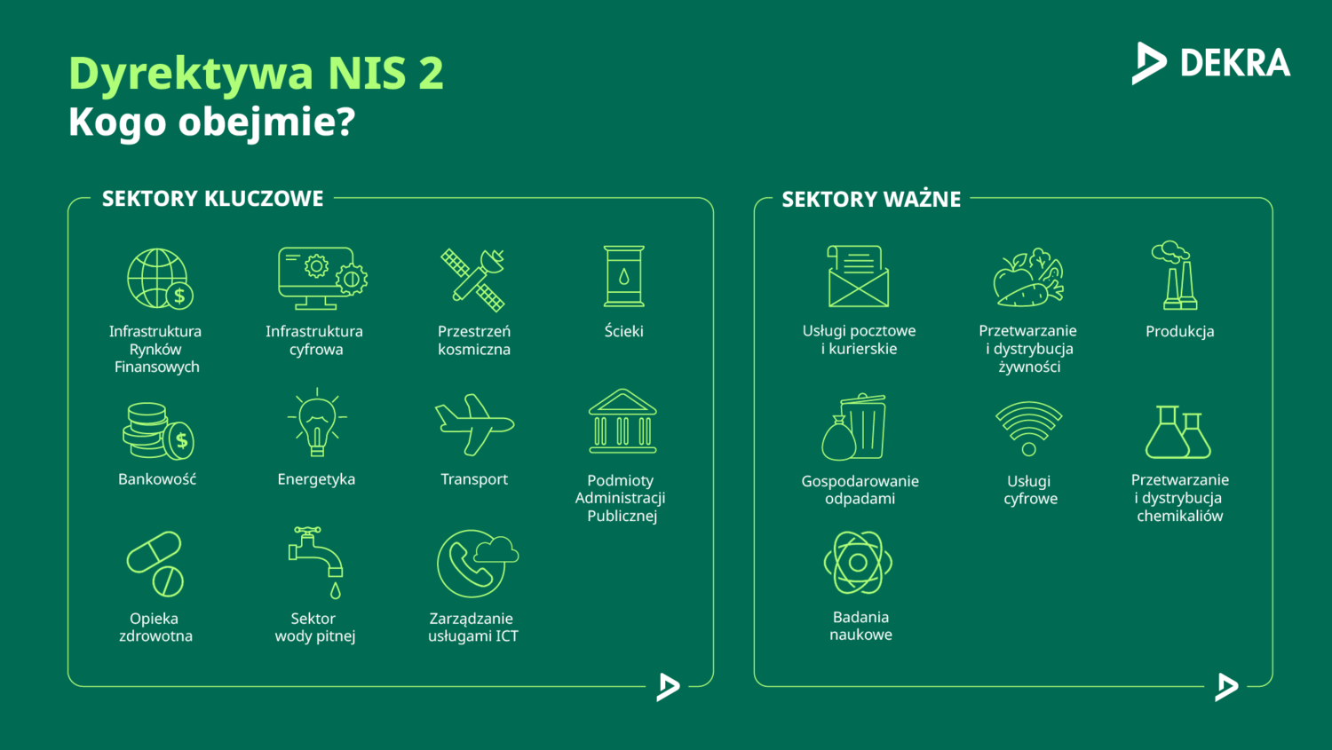 Zakres podmiotowy dyrektywy został znacząco rozszerzony. Obejmuje on m.in. sektor energii, transportu, ochrony zdrowia, bankowości i infrastruktury rynków finansowych, usług cyfrowych, administracji publicznej, gospodarki wodnej, gospodarki odpadami, produkcji wybranych wyrobów krytycznych oraz usług pocztowych i kurierskich. W praktyce oznacza to objęcie regulacją wielu organizacji, które dotychczas nie podlegały szczególnym obowiązkom w obszarze cyberbezpieczeństwa.